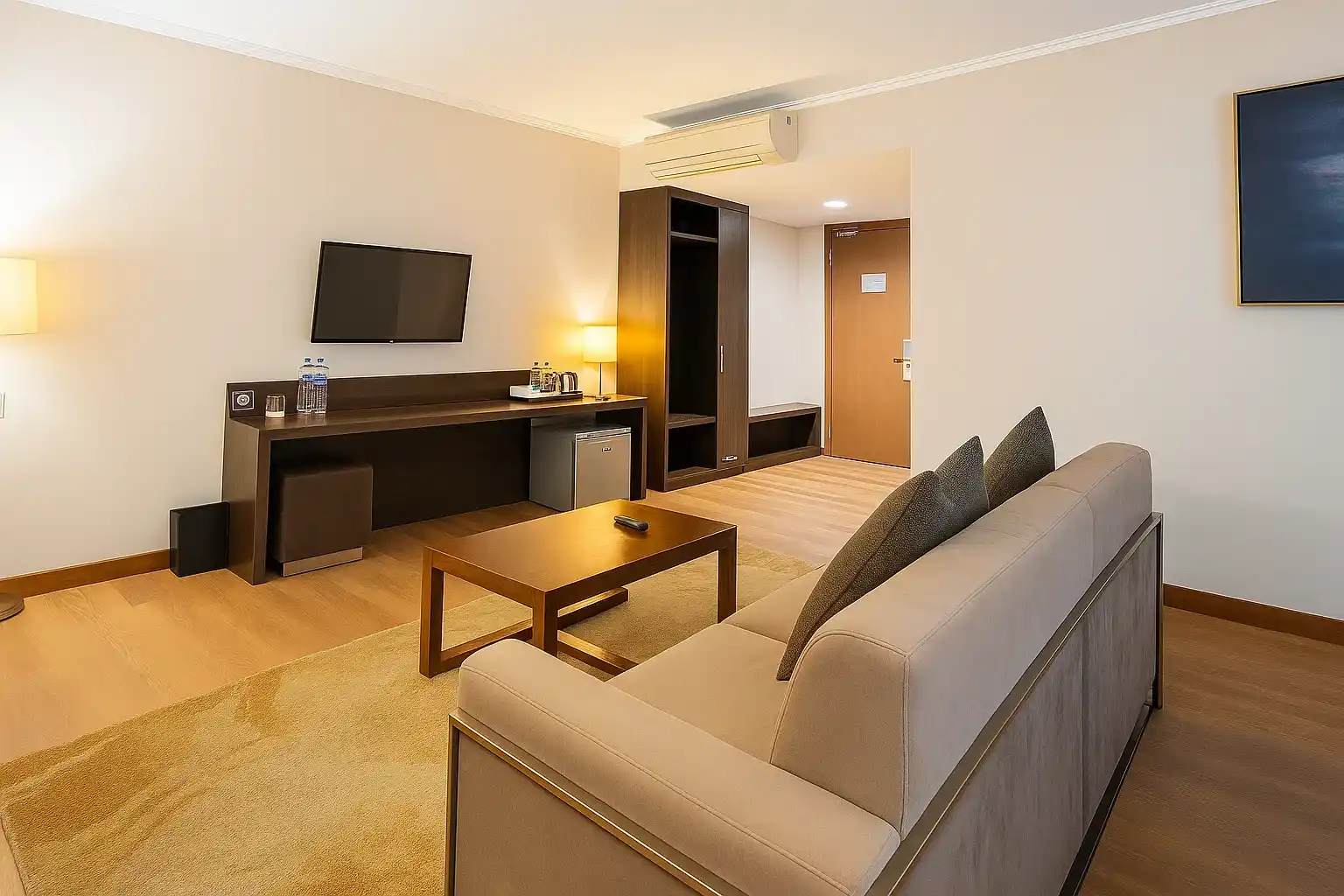 The 41 sqm Family Suite Room at VRATA offers a spacious and inviting retreat, thoughtfully designed with a comfortable living area and modern amenities.